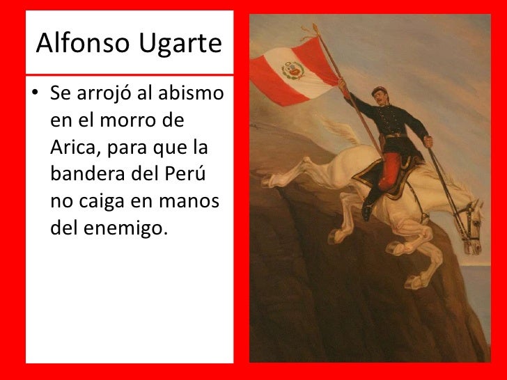 Que alfonso ugarte tomara la decisión de saltar al vacío para proteger la bandera de su país morro de arica. Víctor alvarado las circunstancias heroicas del holocausto del héroe tarapaqueño alfonso ugarte vernal, quien prefirió morir lanzándose de la cima del morro de arica montado en su corcel blanco, no tienen parangón a nivel planetario, porque no hay referentes similares o aproximados a su gesto.